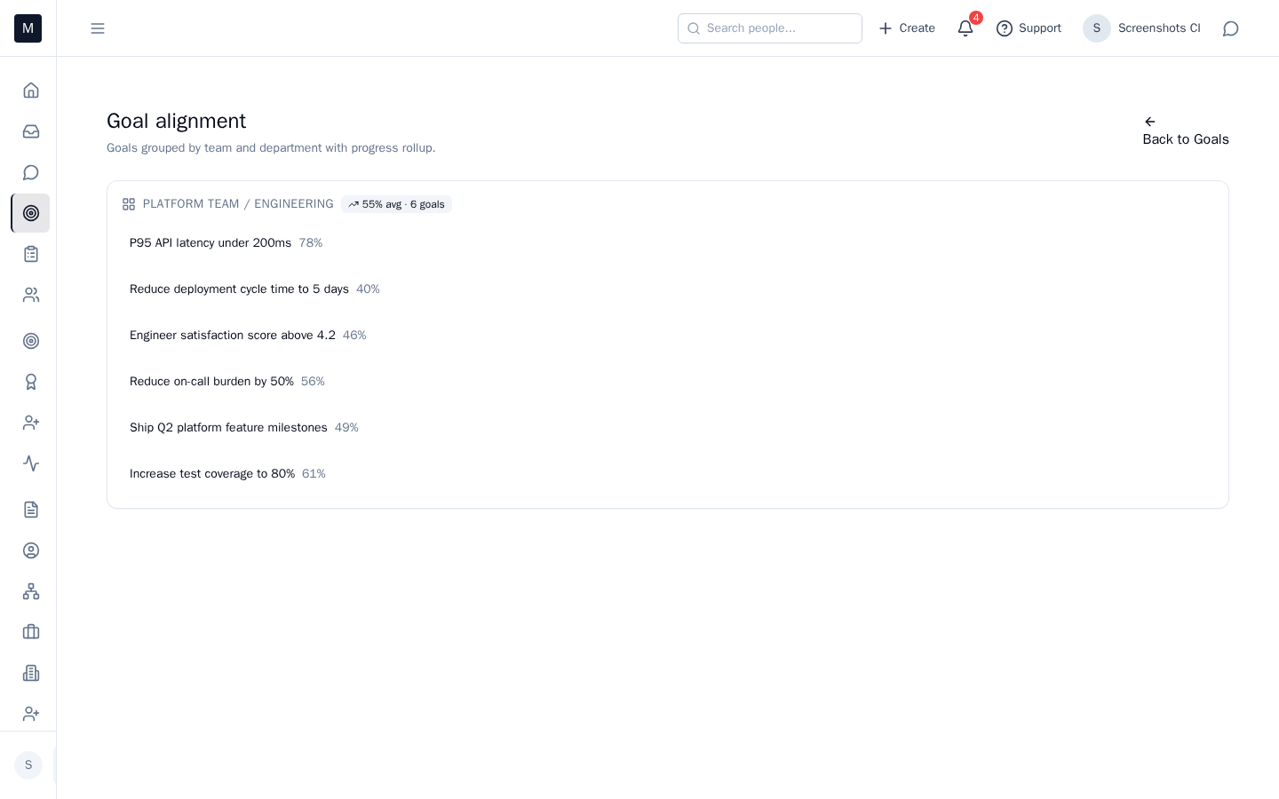 Open Goals from the card. Update progress, add a check-in note, or realign with the owner in a 1:1. One place for goals and 1:1s keeps the team aligned and cuts surprise at review time.