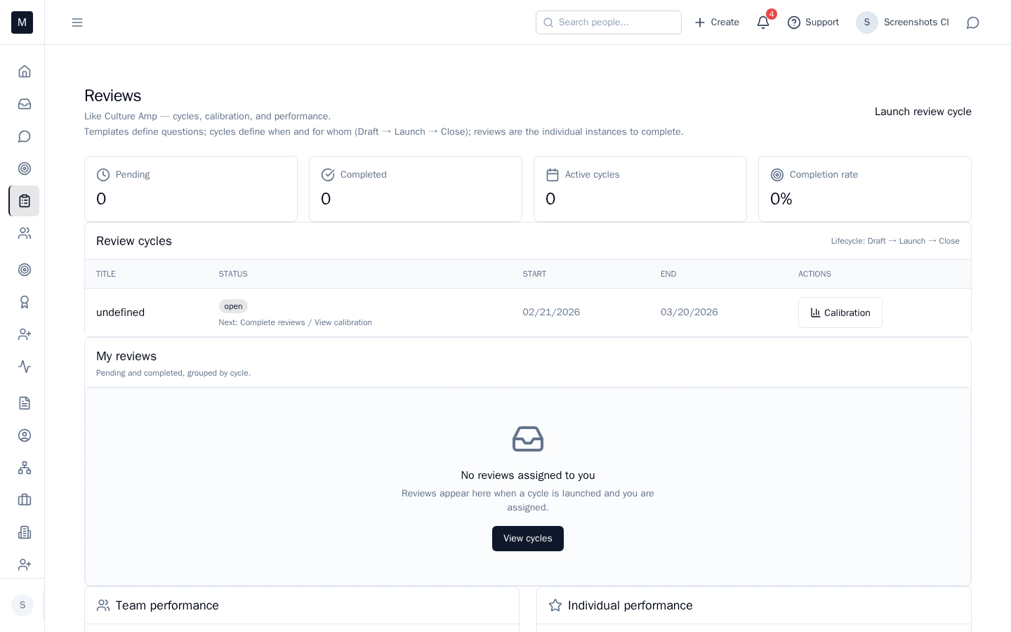 Open Reviews from the card. Launch or run the cycle, complete feedback, or schedule the next step. One place for setup, progress, and completion — same system as 1:1s and goals.